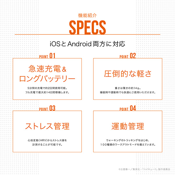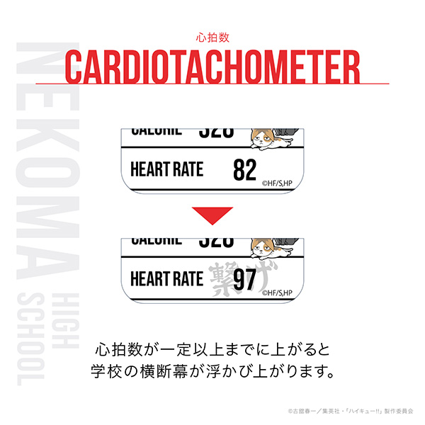 アニメ「ハイキュー!!」とコラボしたスマートウォッチが登場。「烏野高校」 「音駒高校」 モデルの2モデルをラインナップ。チームカラーのベルトやオリジナル文字盤を備えたスタイリッシュなスマートウォッチです。歩数に応じて文字盤上の各高校キャラクターが次々と変化する遊び心あふれるギミックを搭載。さらに、心拍数が一定以上になると学校の横断幕が浮かび上がるなど、作品の世界観を楽しみながら健康管理ができるユニークな仕様を備えています。急速充電可能で、一回の充電で最大14日もつロングバッテリーを備え、ストレス管理や運動管理も可能。軽量設計で、機能面も充実しています。「ハイキュー!!」の世界観を楽しみながら、アクティブに使用することができます。