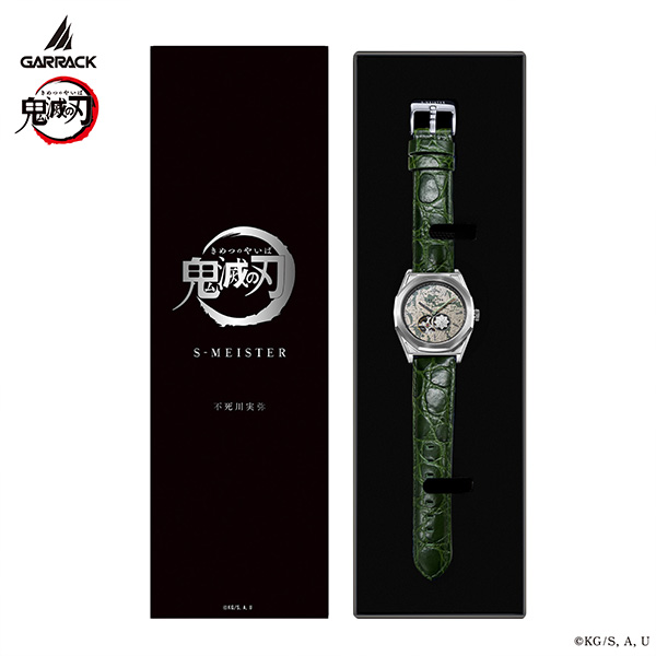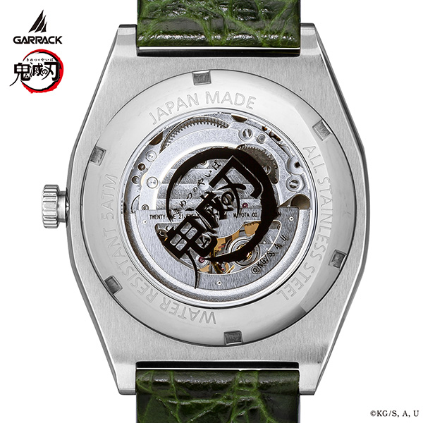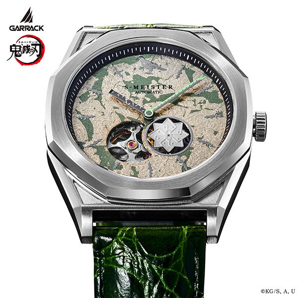 日本の伝統工芸「金沢箔」を使用し、アニメ「鬼滅の刃」キャラクターの特徴を再現した自動巻き機械式時計。 文字盤を熟練の職人が一つ一つ手作業で仕上げた芸術品ともいえる逸品。 時計の心臓部であるムーブメントは日本製を使用し、日本で組み立てたメイドインジャパンモデルです。 文字盤には傷や風をイメージした白と緑の模様の銀箔が鮮やかに輝きます。 1秒ごとに回転するディスクは日輪刀の鍔をモチーフにしたデザインをあしらっています。 分針は日輪刀を、時針にはその鞘をイメージしています。12時位置のインデックスにはアクセントとして鎹鴉のモチーフが配置されています。