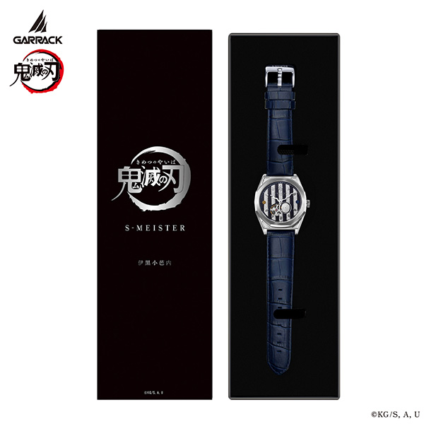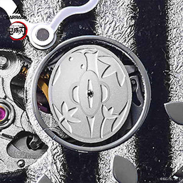 日本の伝統工芸「金沢箔」を使用し、アニメ「鬼滅の刃」キャラクターの特徴を再現した自動巻き機械式時計。 文字盤を熟練の職人が一つ一つ手作業で仕上げた芸術品ともいえる逸品。 時計の心臓部であるムーブメントは日本製を使用し、日本で組み立てたメイドインジャパンモデルです。 文字盤には伊黒小芭内の羽織をイメージした白と黒の縞柄をデザイン。繊細な光沢を放ちます。 1秒ごとに回転するディスクは日輪刀の鍔をモチーフにしたデザインをあしらっています。 分針は日輪刀を、時針にはその鞘をイメージしています。 インデックスにはアクセントとして12時位置に鏑丸、3時と9時位置には伊黒のオッドアイをイメージしたパーツが配置されています。