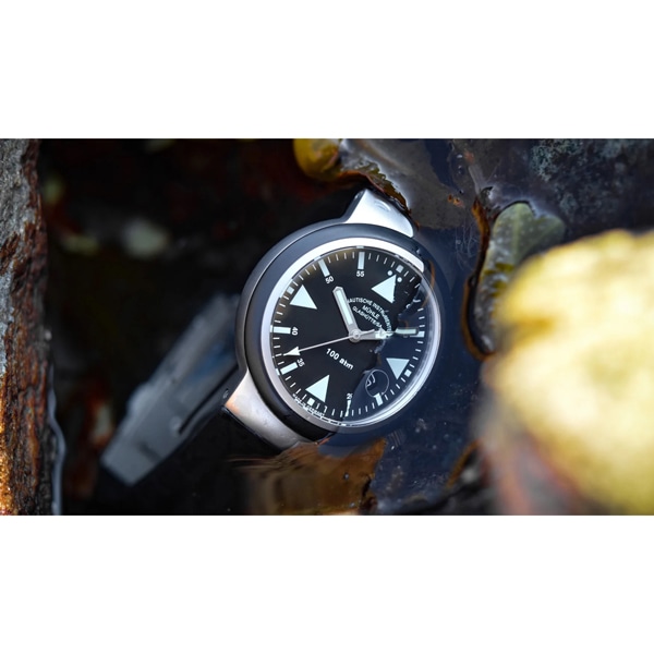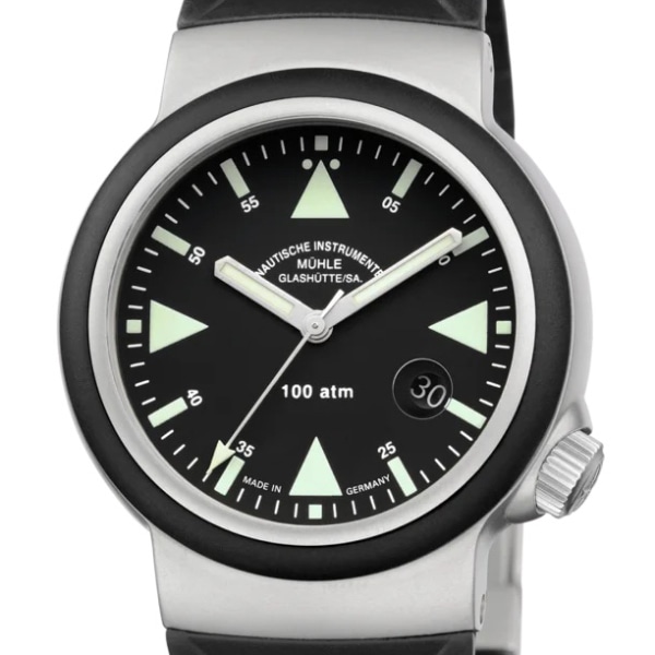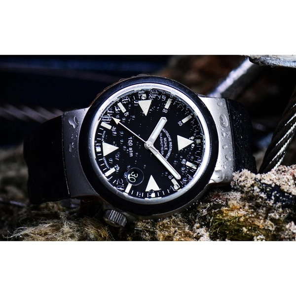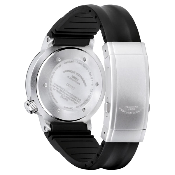 S.A.R.Rescue Timerは、ドイツ海難救助協会から直々に依頼を受け、作られたというストーリーのある特別なモデルです。かつてミューレ社は大手自動車メーカーなどの計測器やタコメーターを手掛けるメーカーでしたが、その精度や耐久性を評価していた海上救助隊が、どんな状況下においても”読みやすく”・”救助の妨げにならない着用時の使い心地”を求め、実用的なツールウォッチとしてこちらのモデルが生まれました。