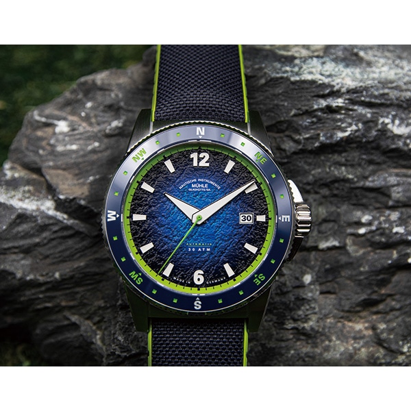 Muhle-Glashutteの新作スポーツウォッチシリーズ「SPORTIVO(スポーティヴォ)」。優れた機能性と洗練されたスポーティなスタイルで、オフィスや仕事後、トレーニング、アウトドアでの冒険など、様々なシーンにおいて日常生活の理想的なパートナーとなるよう設計されていました。SPORTIVO コンパスデイトには、双方向コンパスベゼルが搭載され、長時間のトレッキングにも最適。時計の時針を太陽に向け、コンパスベゼルの南の目盛りを合わせることで、全ての方角が一目で確認できます。ステンレススチールケース、反射防止サファイアクリスタル、セラミックベゼルが組み合わされ、視認性が確保されています。