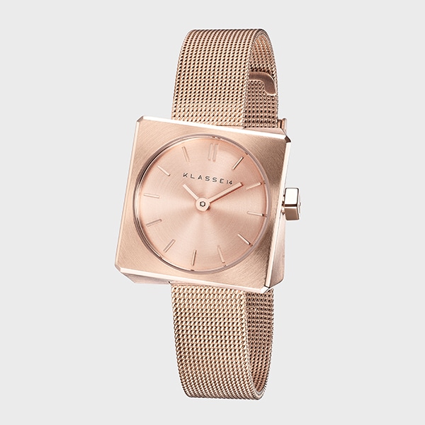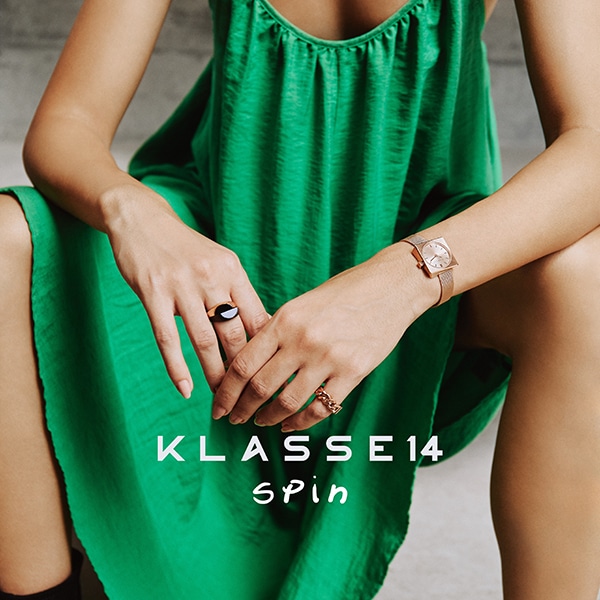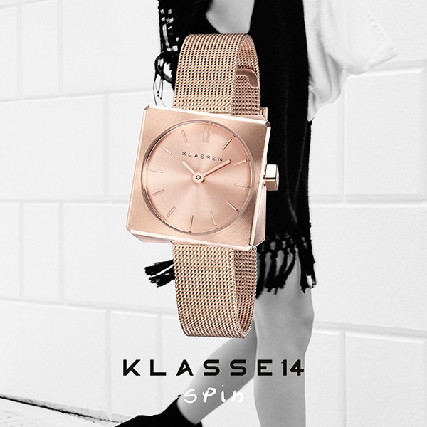 KLASSE14の新コレクションSPIN(スピン)。スクエアケース・文字盤そのものをスピンさせると言う遊び心満載で大胆なデザイン。ケースは25.5mmとブランド最小のサイズです。カラーは人気のローズゴールド・シルバーのメッシュストラップ。新エレメンツを採用したマーブル文字盤のホワイト&ブラックレザーストラップの4色展開。レザーストラップは廃棄予定だった有機リンゴの皮を、アップサイクルすることで生まれたサステナブルなAppleskin(アップルスキンレザー)をKLASSE14で初採用。地球に優しいニューフェイス”SPINが発売です!