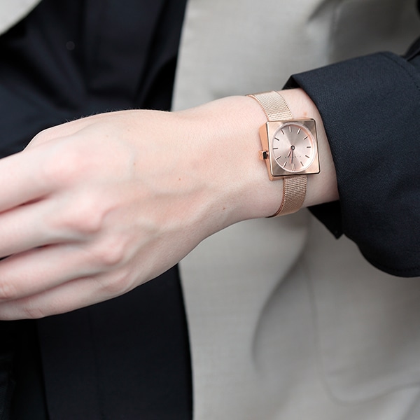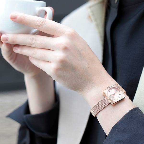 【ケースサイズ】横25.5mm バンド幅12.0mmKLASSE14の新コレクションSPIN(スピン)。スクエアケース・文字盤そのものをスピンさせると言う遊び心満載で大胆なデザイン。ケースは25.5mmとブランド最小のサイズです。カラーは人気のローズゴールド・シルバーのメッシュストラップ。新エレメンツを採用したマーブル文字盤のホワイト&ブラックレザーストラップの4色展開。レザーストラップは廃棄予定だった有機リンゴの皮を、アップサイクルすることで生まれたサステナブルなAppleskin(アップルスキンレザー)をKLASSE14で初採用。地球に優しいニューフェイス”SPINが発売です!