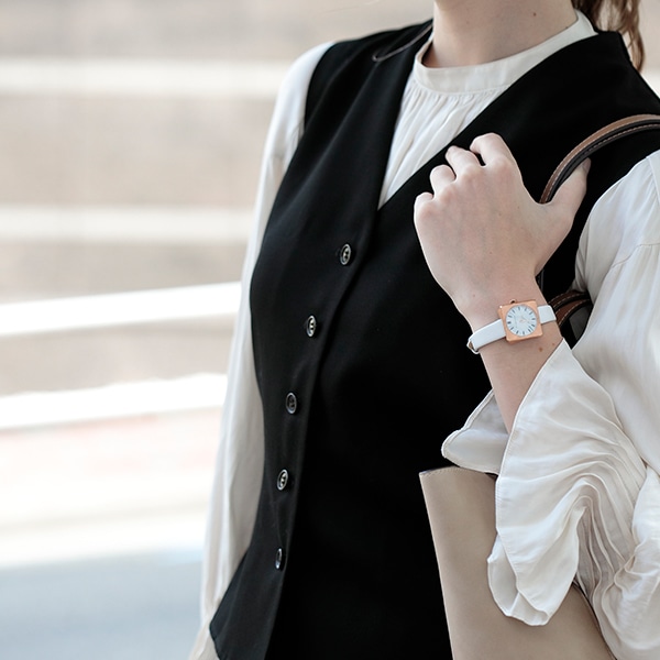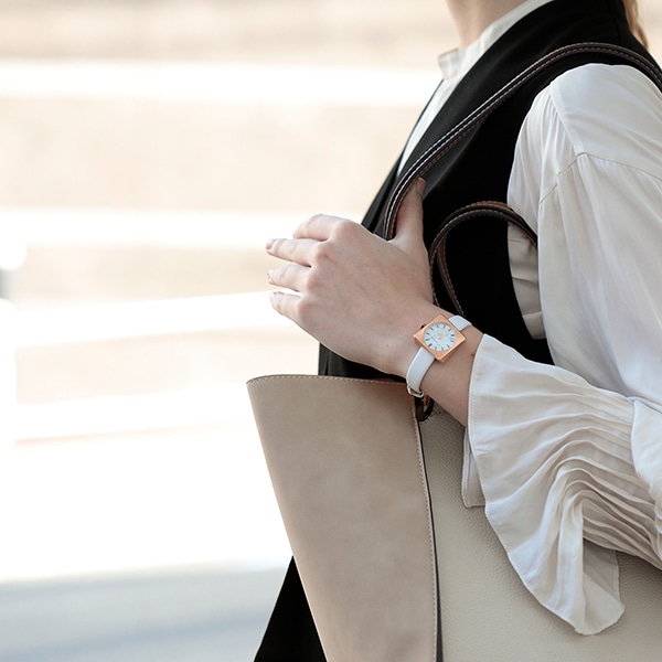 【ケースサイズ】横25.5mm バンド幅12.0mmKLASSE14の新コレクションSPIN(スピン)。スクエアケース・文字盤そのものをスピンさせると言う遊び心満載で大胆なデザイン。ケースは25.5mmとブランド最小のサイズです。カラーは人気のローズゴールド・シルバーのメッシュストラップ。新エレメンツを採用したマーブル文字盤のホワイト&ブラックレザーストラップの4色展開。レザーストラップは廃棄予定だった有機リンゴの皮を、アップサイクルすることで生まれたサステナブルなAppleskin(アップルスキンレザー)をKLASSE14で初採用。地球に優しいニューフェイス”SPINが発売です!