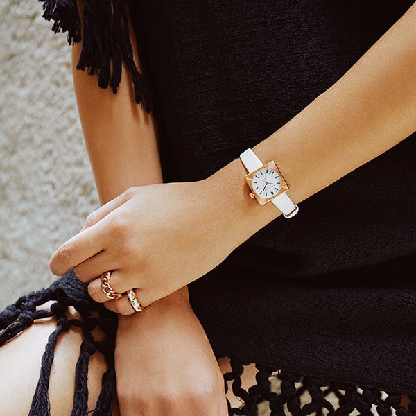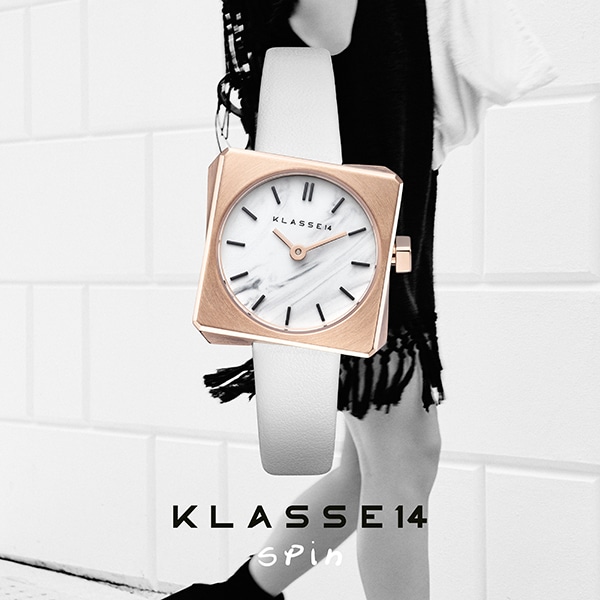 KLASSE14の新コレクションSPIN(スピン)。スクエアケース・文字盤そのものをスピンさせると言う遊び心満載で大胆なデザイン。ケースは25.5mmとブランド最小のサイズです。カラーは人気のローズゴールド・シルバーのメッシュストラップ。新エレメンツを採用したマーブル文字盤のホワイト&ブラックレザーストラップの4色展開。レザーストラップは廃棄予定だった有機リンゴの皮を、アップサイクルすることで生まれたサステナブルなAppleskin(アップルスキンレザー)をKLASSE14で初採用。地球に優しいニューフェイス”SPINが発売です!