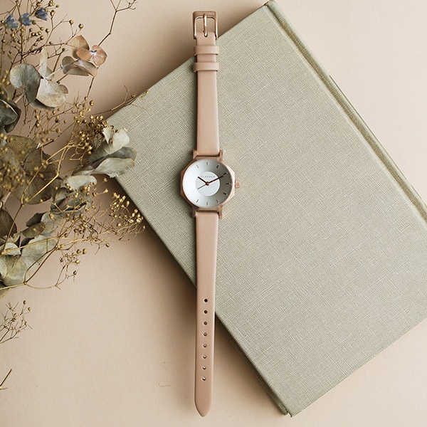 TiCTAC系列店でしか購入できない別注モデル。2021年ウインターシーズンの新作は8角形のケースが特徴的Volare OKTOから2品番が登場。ローズゴールドケース×ホワイトMOP文字盤はライトグレーのレザーストラップとの組み合わせでトレンドを取り入れたモデル(WOK21RG013S)。シャンパンゴールドケース×マットグレーカラー文字盤(WOK21CE003S)は、落ち着いた上品な印象に仕上がっています。28mmケースは程よいサイズ感でこれからのニットコーデなどとも相性ピッタリ。