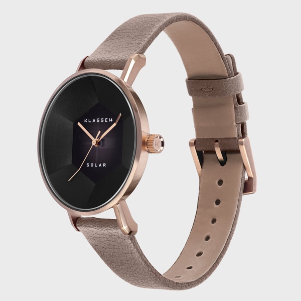 KLASSE14よりブランド初となる太陽光電池を使用したソーラー時計『Volare Solar』.。ケースはリサイクルしたステンレススチールにソーラームーブメントを搭載。ストラップにはリンゴの皮を再利用したアップルピールレザーを採用しています。商品のパッケージBOXは100%再生紙を使用したサステナブルで環境に優しいモデルとなっています。文字盤の中心部は太陽の光をイメージした六角形に、従来のVolareよりスリム見えする最新デザインのケースは、39mm&34mmの2サイズの展開しています。カラーのバリエーションは、『Horizon Champagne』、『Deep blue Vintage』、『Darkness Rose Gold』の3種類。環境に優しいVolare Solar、是非お試しください!
