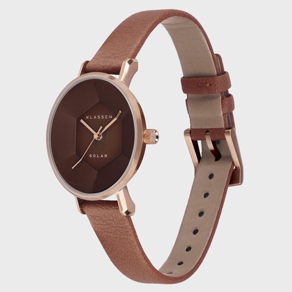 KLASSE14よりブランド初となる太陽光電池を使用したソーラー時計『Volare Solar』.。ケースはリサイクルしたステンレススチールにソーラームーブメントを搭載。ストラップにはリンゴの皮を再利用したアップルピールレザーを採用しています。商品のパッケージBOXは100%再生紙を使用したサステナブルで環境に優しいモデルとなっています。文字盤の中心部は太陽の光をイメージした六角形に、従来のVolareよりスリム見えする最新デザインのケースは、39mm&34mmの2サイズの展開しています。カラーのバリエーションは、『Horizon Champagne』、『Deep blue Vintage』、『Darkness Rose Gold』の3種類。環境に優しいVolare Solar、是非お試しください!