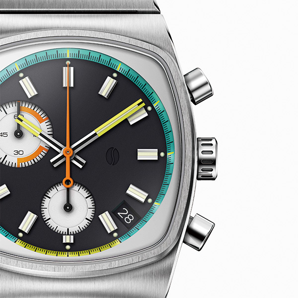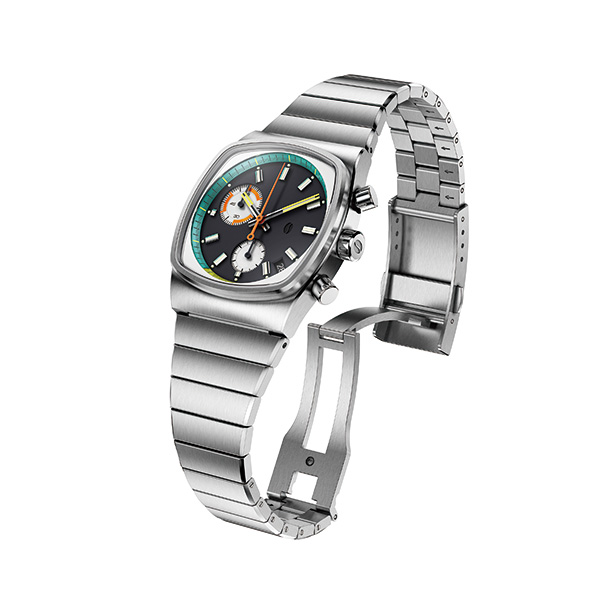 1970年代のテレビ画面を思わせるトノー型ケースに、レトロモダンなブラック文字盤を組み合わせた「Metric」シリーズ。クラシックと現代デザインの融合で、日常をスタイリッシュに彩ります。
