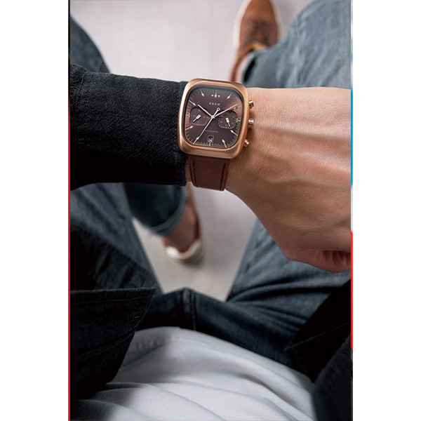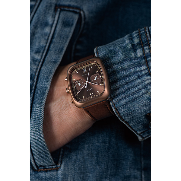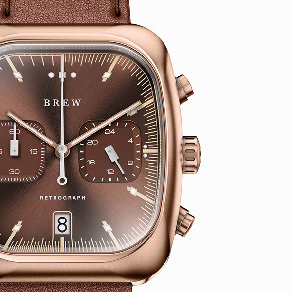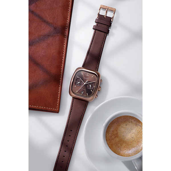 ブラウンのサンバースト文字盤にローズゴールドPVDケース、茶色レザーストラップを組み合わせた“エスプレッソ”クロノグラフ。ヴィンテージ感漂うクッションケースに、25~35秒のエスプレッソ抽出タイムを視覚化する実用美を凝縮した設計です。