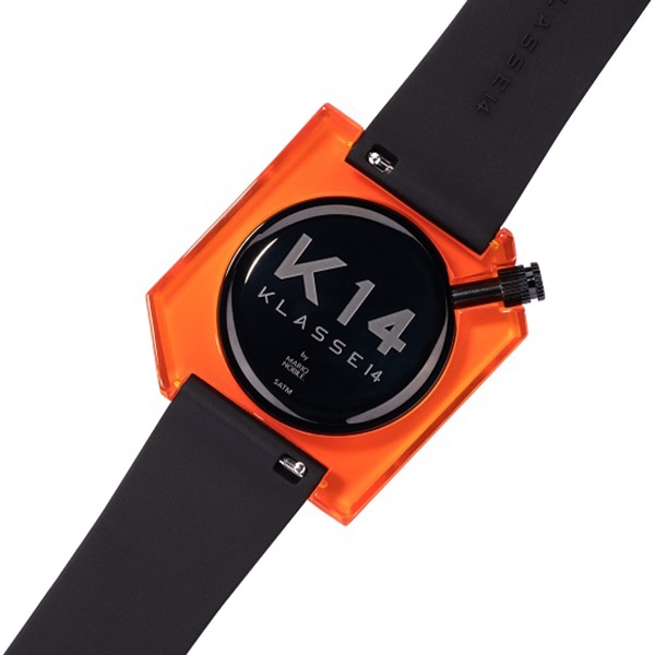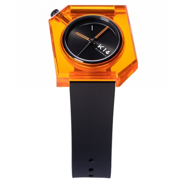キャッチーなカラーリング、スケルトン素材を使用したアシンメトリーの四角いケース、斜めになったリューズと個性あふれる『K14』
