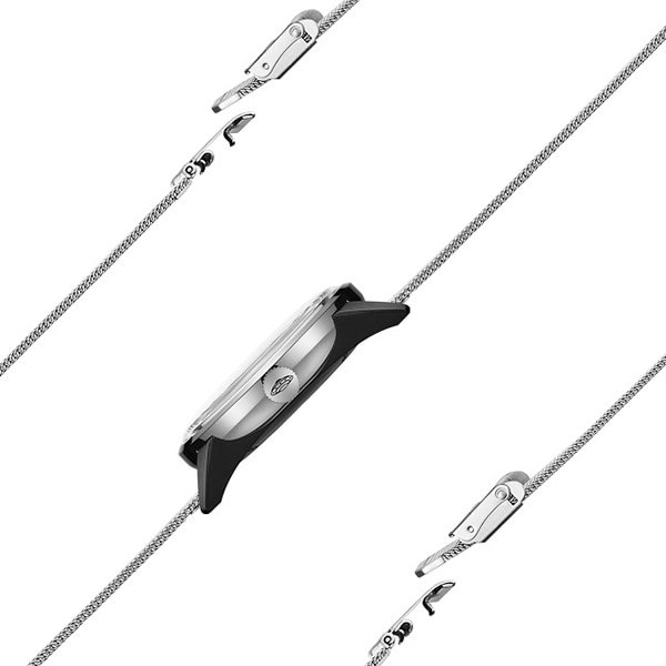 KLASSE14デザイナーのマリオは10代の頃UFOの話に魅了されていました。大気中に静かに高速で浮遊することのできるUFOに想いを重ね、ディスコボランテ(英語名:フライングソーサー)と命名。デザインはフライングソーサー形を模したバックケースとドーム型のレンズが特徴的。UFOフィーバーの起こった50-60年代を想起させるヴィンテージ感もポイントです。今回のメッシュベルトは、ビジネスシーンだけでなくプライベートのスタイリングにも使えるデザイン。付属の型押しレザーベルトに付け替えれば、また違った表情を楽しめます。