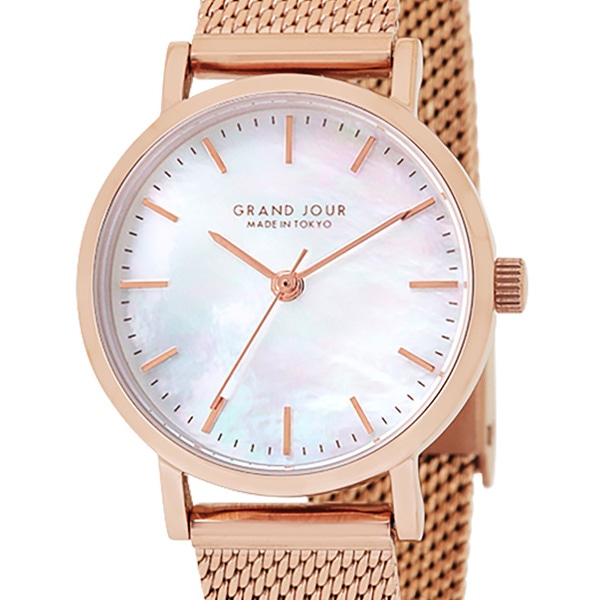 【Designed by TiCTAC】肌馴染みが良く手元が美しく見えるピンクゴールドのメッシュベルトウォッチ。華やかな白蝶貝ダイヤルとシンプルなデザインが特徴です。