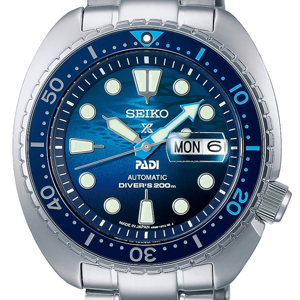 商品コンセプト ~THE GREAT BLUE~ PROSPEXとPADIのパートナーシップを象徴する、新たなコンピレーションシリーズが登場しました。たしかな性能をもつPROSPEXのダイバーズウオッチに、PADIの信頼感と美しい海の景色を表現しています。海中から見上げた、降り注ぐ光と水面の揺らぎをモチーフとしたオリジナルの美しいグラデーションダイヤルが特徴。水中での視認性が高いライトブルーを分針とベゼル表示板に施した特別仕様となっております。