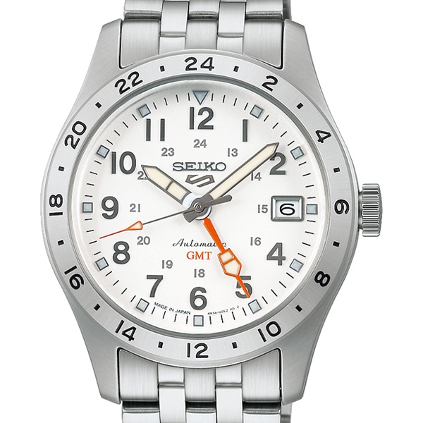 固定ベゼル上面にGMT機能(24時)表記を入れ、 GMTモデルとしての存在感を高めたデザイン。GMT針は時分針のデザインと連動した、大きく目立つ五角形の針を採用。ガラスはベゼル面よりも高さのある、厚みのあるカーブハードレックスを採用し質感を高めております。 バンドには質感高い無垢の多列バンドを採用し、駒のピッチを短めに設定することで装着感を高めております。十分なスポーティースペックでラフな取り扱いにも対応、機械式として抜群のコストパフォーマンスを誇っております。SBSC009(ホワイト)は日本でのみ発売。