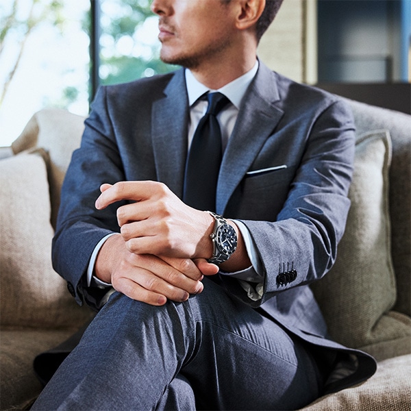 300m空気潜水用防水ながら、腕載りの良いコンパクトサイズを実現。駒ピッチの短いブレスレットとコンパクトバックルの組み合わせにより、心地良い装着感を追求。判読性の高いシンメトリーなダイヤルレイアウトと暗所における視認性向上のため、4-5時位置デイトを採用しております。