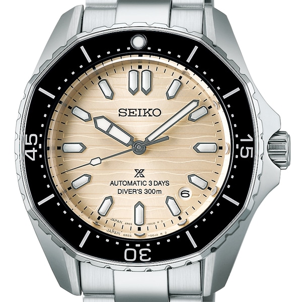 クリーンで爽やかな印象のダイヤルには、穏やかで優雅な海岸線の情景を想起させるダイヤルパターンを採用。針形状とルミブライトによりスポーツウオッチならではの視認性を持ち、暗所でも容易に時刻を確認可能となっております。新キャリバー 6R55(3DAYS)を搭載するほか、空気潜水用防水300mを有しており、本格ダイバーズウオッチとしてのスペックも兼ね備えております。