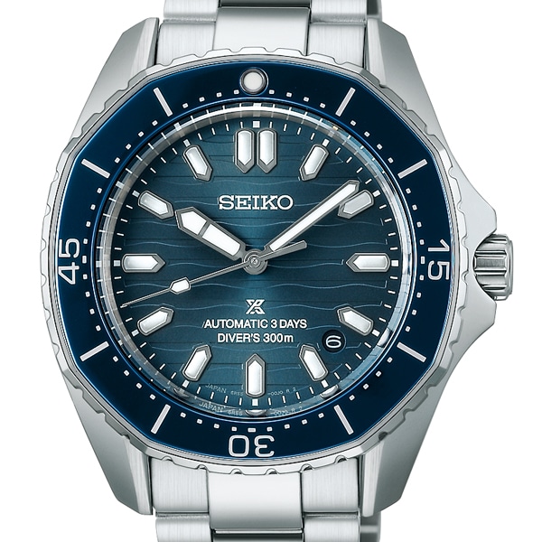 クリーンで爽やかな印象のダイヤルには、穏やかで優雅な海岸線の情景を想起させるダイヤルパターンを採用。針形状とルミブライトによりスポーツウオッチならではの視認性を持ち、暗所でも容易に時刻を確認可能となっております。新キャリバー 6R55(3DAYS)を搭載するほか、空気潜水用防水300mを有しており、本格ダイバーズウオッチとしてのスペックも兼ね備えております。