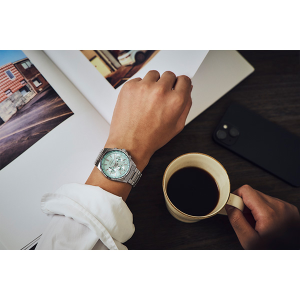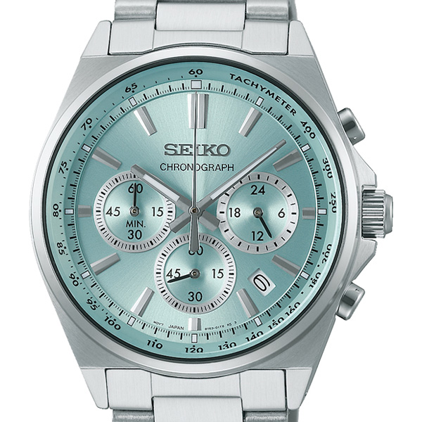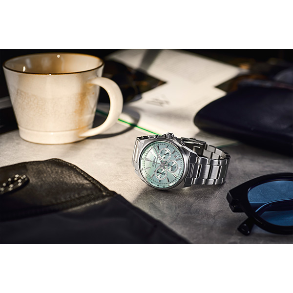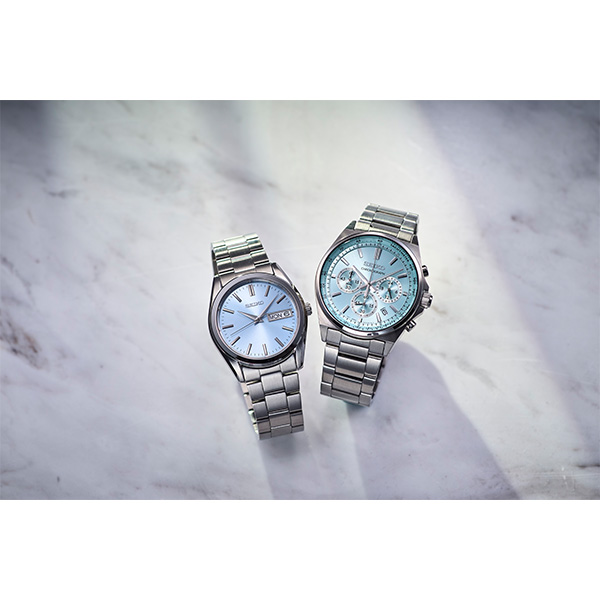 金属ダイヤルの質感を活かした、ファッション性に優れたクロノグラフモデルから法人別注モデルが登場。 スタイリッシュかつ流行に左右されない、スタンダードなデザインのクロノグラフウオッチとなっております。 ケースは、大胆に平面を組み合わせたソリッドな形状にすることで、スタイリッシュなデザインに仕上げました。 タキメーター表記を入れた金属製のダイヤルリング、1/5秒目盛を入れた金属製の植えリングをダイヤルと組み合わせることで、緻密な造形をもたせています。 ダイヤルは、金属ダイヤルならではの質感を活かした放射が美しい仕様を採用し、それぞれの法人のこだわりのカラーリングで上質かつスタイリッシュな印象に仕上げました。 ダイヤル上に12箇所あるバーインデックスは、サイドをカットした上で、上面を虹挽きにすることで、上質感を出しました。 10気圧防水、JIS1種の耐磁対応、らくらくアジャスト方式のメタルバンドで使い勝手も抜群です。 郊外チェーン流通専用モデルは、爽やかな水色のダイヤルを採用。金属ならではの放射状に光が美しく反射する質感がポイントです。