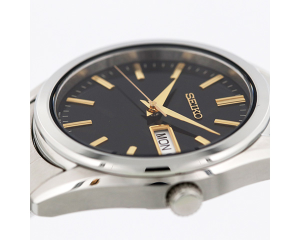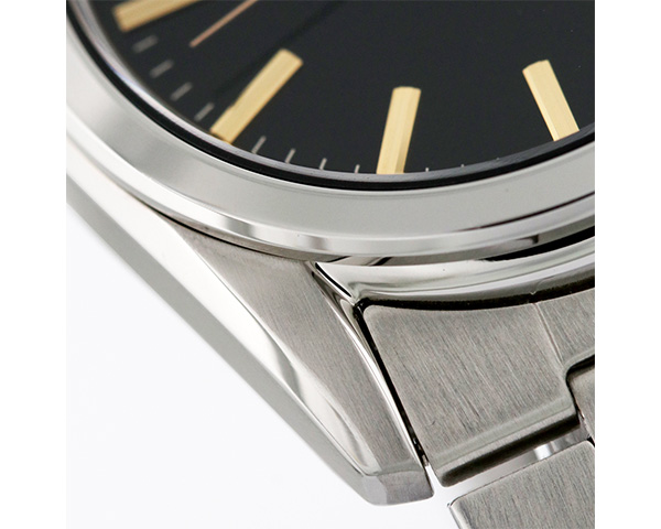 37.4mmと、コンパクトなサイズを実現したケースは、縦筋目と鏡面を使い分けることでさらにスタイリッシュな印象に。細縁でありながらも広い見切りを確保し、ブラックダイヤルに見合う重厚感を演出しています。