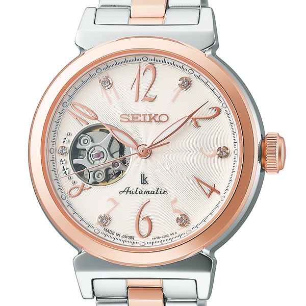 ダイヤルは、すっきりエレガントな佇まいのアラビアフォントと、淡いピンク~透明のクリスタルガラスを組み合わせたルキアで人気のレイアウトです。9時位置にオープンハートをレイアウトし、メカニカルらしい表情が楽しめるデザインとなっています。その左側にはクリスタルガラスとともに植え略字をレイアウトし、ルキアならではのビジュー感あるオープンハートのデザインとなっていまケースはコの字型のカン足フォルムを採用し、ボリューム感のあるケースでありながら軽やかさを感じさせます。
