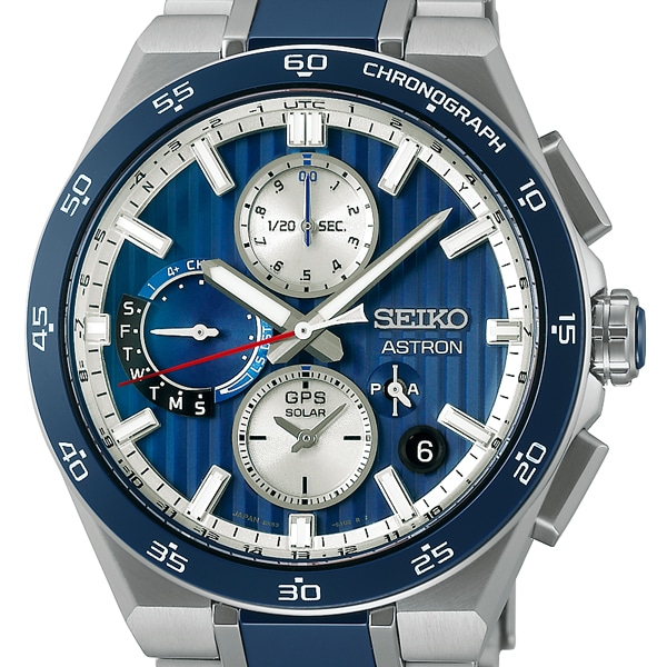 Nexter GPSソーラー デュアルタイムクロノグラフレギュラーモデル初となるブルーセラミックスをベゼル、ブレスレット中駒、りゅうずトップに採用したワンランク上のスポーティデザインのモデルが登場。ケースダイヤルとサブダイヤルの色が異なるコントラストの効いたダイヤルカラーを採用 ブルーとホワイトシルバーのコンビネーションが精悍かつ爽やかな雰囲気を演出。ダイヤルに施した質感の高いダイナミックな縦縞の型打ちパターンとレッドカラーの秒針アクセントが、よりアクティブな印象を醸成。
