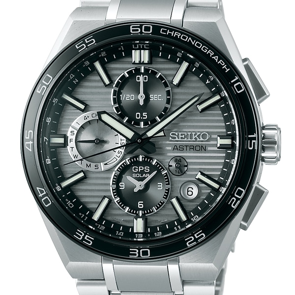 また、腕なじみの良い低重心のチタンケースに高級感のあるデュアルカーブサファイアガラスを採用。鏡面仕上げと筋目仕上げのパーツを組み合わせた、質感の高い5列ブレスレットが腕元でエレガントな雰囲気を醸成。裏ぶたには、ASTRONブランドを象徴するグローブマークを立体的にレイアウトしたハイエンドモデルならではの特別仕様です。