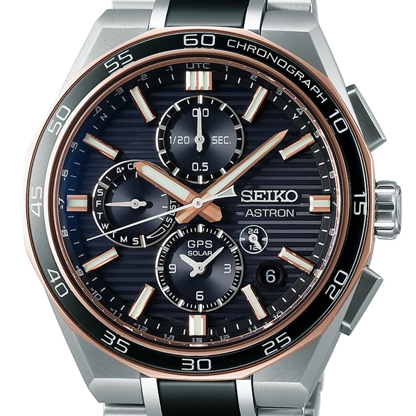 裏ぶたには、ASTRONブランドを象徴するグローブマークを立体的にレイアウトしたハイエンドモデルならではの特別仕様です。深いネイビーカラーのダイヤルと随所にあしらわれたピンクゴールドカラーのアクセントがプレミアムな雰囲気を醸し出す、ハイエンドモデルを象徴する特別な限定モデル。レギュラーとは異なり、多角形状のチタンベゼルを採用することで、より一層輝きを放つスペシャルデザインとなっております。ブレスレットの中駒には艶やかな光沢を放つブラックセラミックスを採用しています。