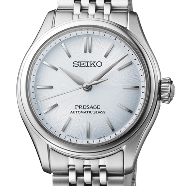 クラシックシリーズより、トラッドな趣向にマッチする小径サイズ(36mm)モデルが登場。ダイヤルの型打ちは小径サイズでも見ごたえのある、絹糸をイメージした繊細な放射模様を施しました。ダイヤルの美しさを最大限引き出すため、あえてカレンダー表示を無くし、ヴィンテージテイストを表現しています。ダイヤルカラーには、江戸時代に愛された、最も薄い藍染の色である藍白を採用。奥深いダイヤルとレトロ感のある繊細な多列ブレスレッドが、トラッドな雰囲気を醸成します。