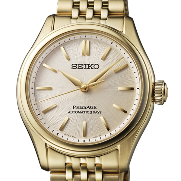 クラシックシリーズより、トラッドな趣向にマッチする小径サイズ(36mm)モデルが登場。ダイヤルの型打ちは小径サイズでも見ごたえのある、絹糸をイメージした繊細な放射模様を施しました。ダイヤルの美しさを最大限引き出すため、あえてカレンダー表示を無くし、ヴィンテージテイストを表現しています。ダイヤルカラーには、何色にも染まっていない、繊維本来の色である素色を採用。奥深いダイヤルとレトロ感のある繊細な多列ブレスレッドが、トラッドな雰囲気を醸成します。