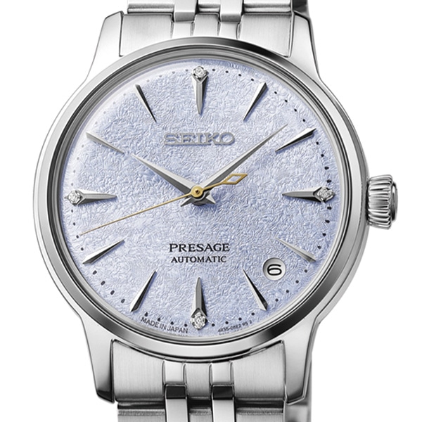 夏のフローズンカクテルをイメージした34㎜サイズモデルが登場。夏らしいフローズンカクテルを意識したクラッシュした氷の表情を思わせる、オリジナリティある型打ちと、さわやかなダイヤルの色味が特徴です。ダイヤをセッティングする4か所の角台座とV字形状略字を今回新しく考案。カクテルタイムのアイコンであるくさび形状の略字はキープしています。ブレスレット形状は、コマのバランスを見直し、テーパーをかけ、より軽やかにアップデートしました。ケースの厚みを軽減するため、通常のスクリュー金属裏ぶたを採用しています。