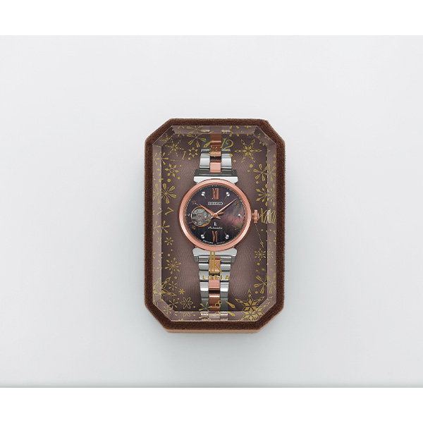 大人でシックな配色と美しい輝きが魅力的な、ホリデーシーズンだけの限定モデルが登場。あたたかい光の中で、葉を落とした樹木の幹がくっきりと浮かび上がる様を、ブラウンのダイヤルカラーと木立をイメージしたランダムな縦ストライプで表現。光の煌めきは白とオレンジのクリスタルガラス、白蝶貝の煌めきで表現しました。