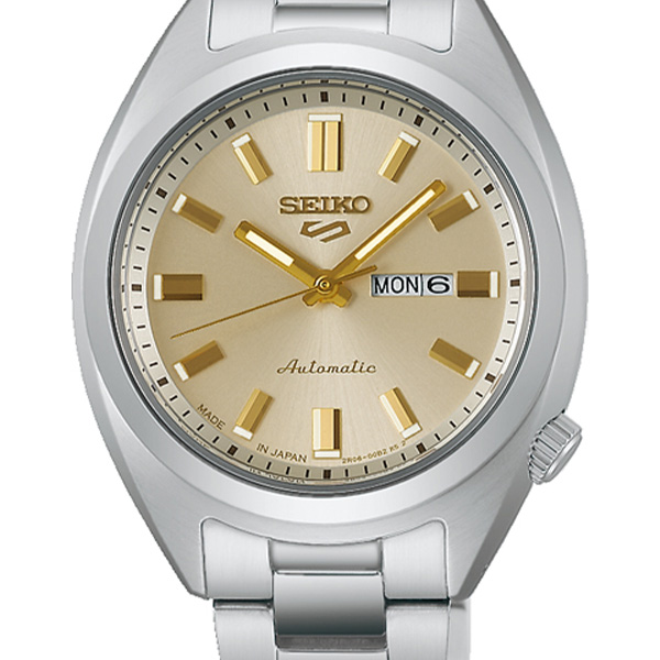 綺麗めファッションに合わせやすい、32mmの新作SNXSが登場。 シリーズ初となる 2R06キャリバー を搭載し、より安定した精度と実用性を実現しました。ケースは、SNXSの象徴である“へびたま”形状を踏襲。 鏡面と筋目を使い分けた稜線仕上げが、高級感のある立体的な表情を演出します。また、略字の上面全体には筋目加工(虹挽き)を施し、さらに細かなピッチの新規メタルブレスレットを採用。 金属植え略字の質感が映える、アクセサリーと相性の良い ゴールドをキーカラー としています。ダイヤルカラーは、クラシカルなケース造形を引き立てる落ち着いた色味を選定。 SNXSらしいヴィンテージ感と上品さを兼ね備えた一本です。