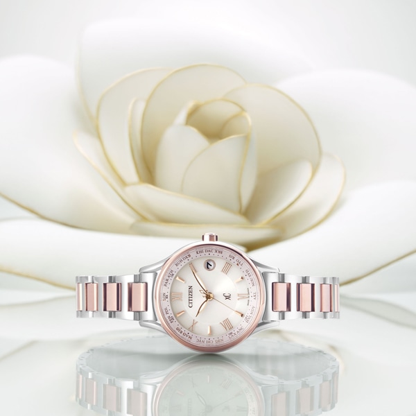 女性の肌を美しく見せる色「サクラピンクR」を使い、ミニマル&エレガントを基調にデザインした新モデルが登場。光発電エコ・ドライブやハッピーフライト機能が、働く女性のパートナーになります。「Bloom」をテーマにデザイン。ありのままで前を向いて歩いていけば、きっと自分らしい花が咲く。そんな想いを込めました。「サクラピンクR」とプラチナ配合の「エターナルプラチナ」のツートーンカラーが加わり、ベーシックな仕上がりになっています。華奢で繊細なケースラインにすっきりエレガントなワイドオープンの文字板、やさしい印象のオリジナルフォントを採用。きりっとした表情の植え字を使い、女性が持つしなやかな強さを表現しています。都市表記には、持ち主の願いが花ひらくようにと想いを込め「BLOOM」の隠し文字、 4時と5時の間(TYO)には桜の花びらをあしらっています。