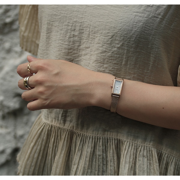 ハンサムな印象のレクタンギュラーケースにカットガラスを合わせた、オーセンティックなデザイン。幅広い年代の 方に愛される1本です。 シルバー、イエローゴールド、ローズゴールドの3色展開。りゅうずには、それぞれのカラーに合わせた 差し色が施されています。文字板はすっきりとした印象のバーインデックス。小さいサイズながらも視認性の良さにこだわりま した。