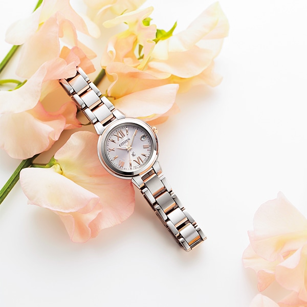 前を向く女性を応援する、シチズンクロスシー。ロングセラーモデルが、ハッピーフライト機能を搭載し、進化してリニューアル。愛され続けるデザインはそのままに、ハッピーフライト機能を搭載し、進化してリニューアル。世界24 都市の時刻がすぐわかります。文字板のデザインは、透き通る花びらの重なりをイメージ。草花のような伸びやかで柔らかい印象のインデックス、光の角度によって淡く繊細に浮き出る花びら が、上品で華やかな手元を演出します。