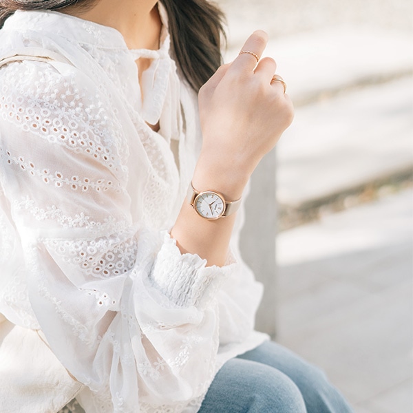 シンプルで見やすい文字板の12時位置にはときめくダイヤでアクセント を施しました。3・6・9時位置には、繊細なリングをイメージしたキラっと輝く植字を置き、さ りげないおしゃれ可愛さを演出しています。切分にはポイントカラーのピンクでカジュアルのみでなく、きちんと女の子らし さも引き立てます。