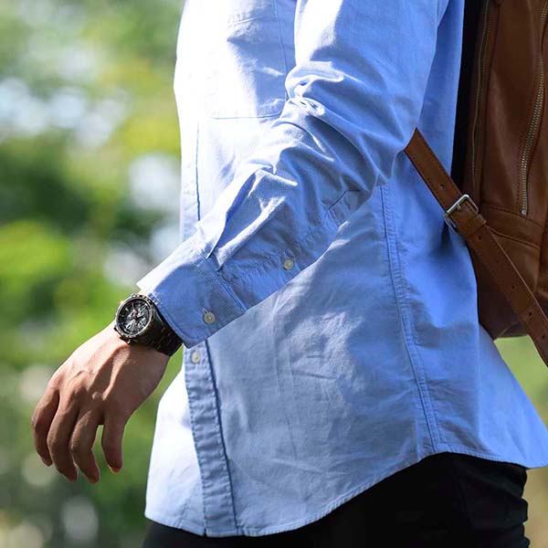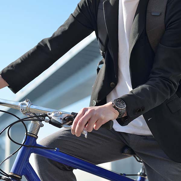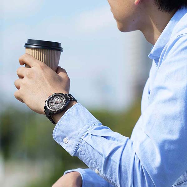 多様化するビジネススタイルに合わせ、スーツスタイルとカジュアルの両方で使える、力強く軽快なデザインの「ACT Line」。アクティブな印象を与える、存在感のあるケースと丸型のプッシュボタン。デザインのアクセントになっているオレンジの差し色。ON/OFFを問わず様々なシーンになじむ、洗練された佇まいと上質なブラックボディが特徴です。