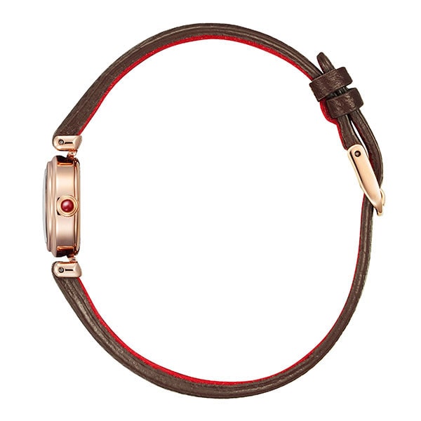 ころんとした可愛いフォルム、華奢な印象のラウンド型ケース、飾りピンに見立てたアクセントパーツがシックでアンティークな印象を演出します。インデックスはクラシカルでマニッシュな印象のローマ字フォントを採用し、秒単位で時間が確認できるようにプリント。小さめの文字板でありながらも見やすいデザインです。風合いのあるカーフ革バンドは裏地のカラーリング(赤)にもこだわり、細部までおしゃれ感を追求。長くご愛用いただけるよう、市販の革バンド(ベルト幅:7mm)への付け替えも可能です。