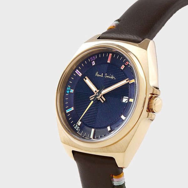 ポール・スミスウオッチで人気の「クローズド アイズ」に、シックなネイビーの文字板を採用したペアウオッチ「クローズドアイズ ペア」が登場。ケースには、高級感のあるウォームゴールドを採用。上品なブラウンのストラップにポール・スミスの象徴であるアーティストストライプのカラーステッチがさりげないアクセントになっています。