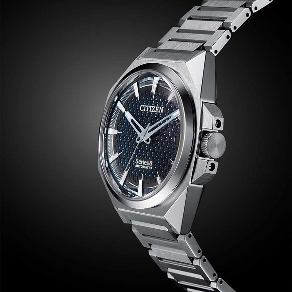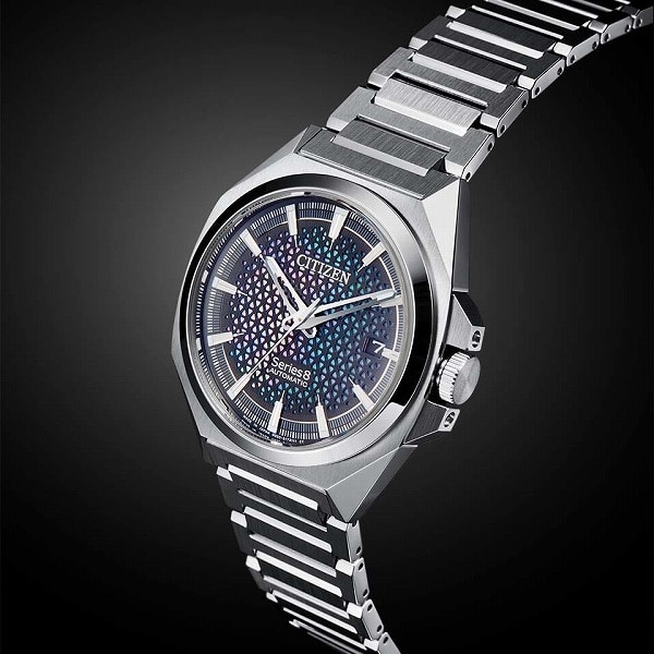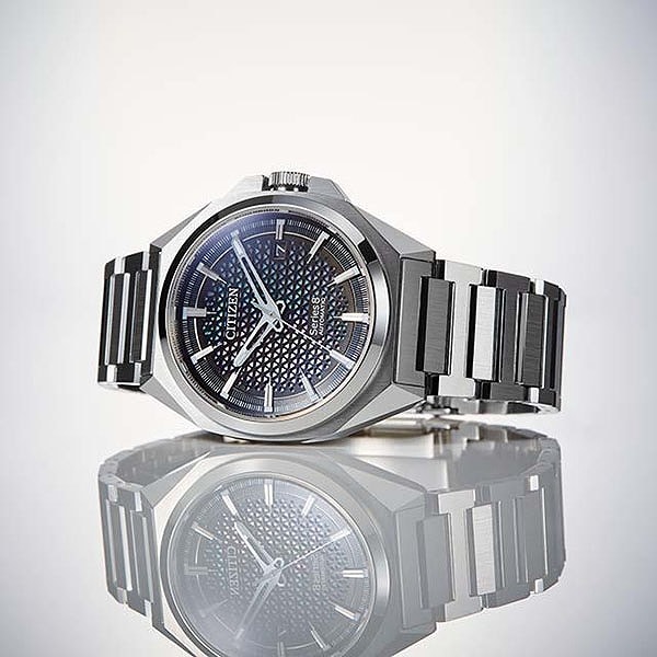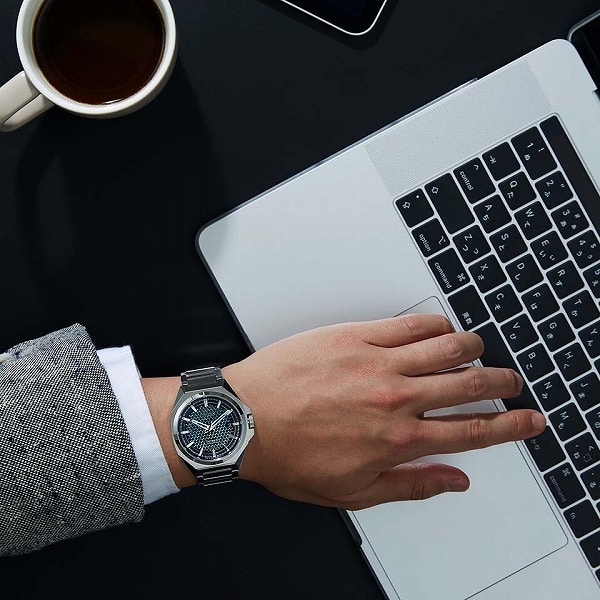 新開発の薄型メカニカルムーブメントCal.0950を搭載。強化耐磁性能と高精度を備えながらもスリムに仕上げ、装着感にもこだわりました。独特の存在感を放つ3層構造の文字板。最上面に配した格子状の金属文字板とその下から見える白蝶貝の文字板が、鮮やかな印象をもたらします。直線的なラインを活かしたケースとバンドに粗めのヘアライン加工を施し、ソリッド感を強調。大きめのりゅうずが巻上げをスムーズにするとともに、力強い印象を与えます。