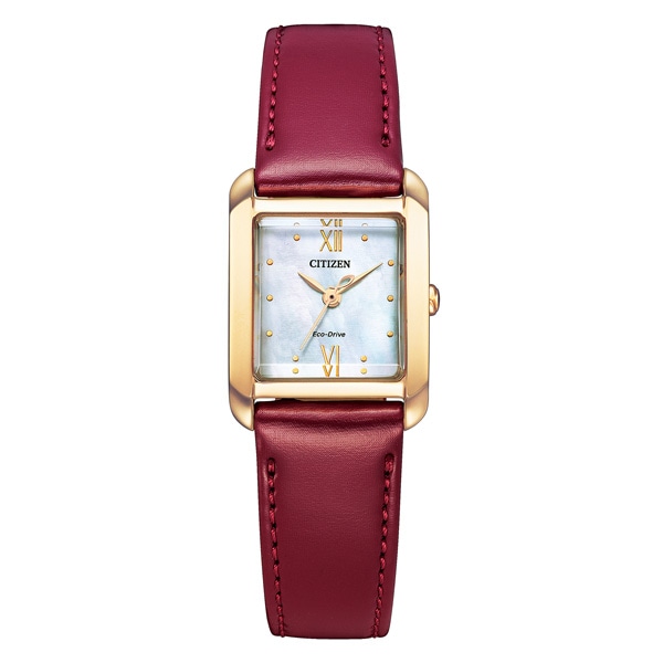 大胆なカットを施したカーブサファイアガラスと、やや丸みをおびたケースラインが、女性のしなやかさと芯の強さを感じさせるデザイン。文字板は「光の揺らぎ」をテーマに、ストライプのパターンとラメの煌めきが、深みのある美しさを演出しています。