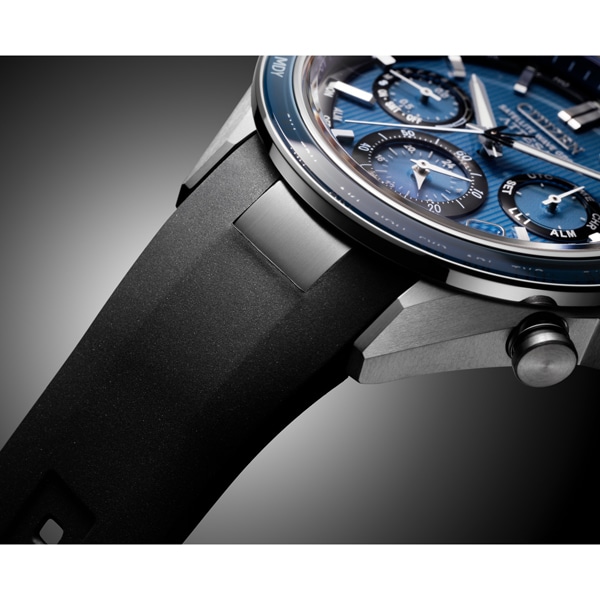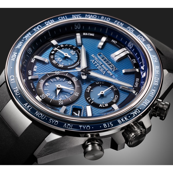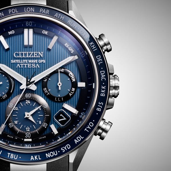光沢感を生かした黒/青ベースを採用しています。ミラー仕上げのベゼルの都市名表記など、光の性質と装飾性を両立させました。サファイアベゼルと調和する光沢感のある文字板。大きく安定感のある6時位置のサブダイヤル。細くシックな印象を与えるブルーのサファイアベゼル。ケースと文字板は、シルバー/ブラック/ブルーを使い分けることで精悍な印象に仕上げています。このモデルのために開発された形状のウレタンバンドが、アテッサの新たな魅力を感じさせます。長く機能性を重視したインデックス。他のモデルとは一線を画す仕上がりが所有欲を掻き立てます。