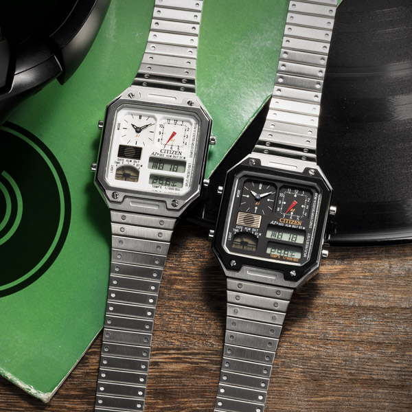 CITIZENの多彩な個性を記録(Record)し続けるインディーズスピリットを持ったウオッチ「RECORD LABEL」の新ラインアップです。1982年、温度センサー搭載のコンビネーションウオッチとして登場し、個性豊かなデザインで多くのファンに愛された「サーモセンサー」を現代版としてアップデートしました。別体ベゼルやバンドの飾り穴が、コンビネーションクオーツのレトロな表情を強調。武骨でありながらも洗練されたデザインは愛着が湧くこと間違いなしの1本です。