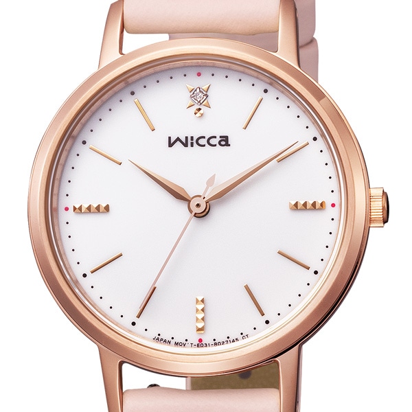 ウィッカで人気ナンバーワンのカジュアルファッションに合わせやすいモデルに新色が登場しました。ケースサイズが約30mmと少し大きめサイズです。人気のソーラーテック対応モデルで、カジュアルファッションにあわせやすいシンプルなデザインの新配色です。文字板12時の位置に1ポイントのダイヤモンド、3・6・9時の位置には輝くカットパーツを配置。透明感のあるシンプルなデザインを施し、ピンクゴールドのケースとあわせることでトレンド感も取り入れました。肌なじみが良いピンクのバンドは、環境に配慮した合成皮革「エコペット(ECOPET)」を使用しています。