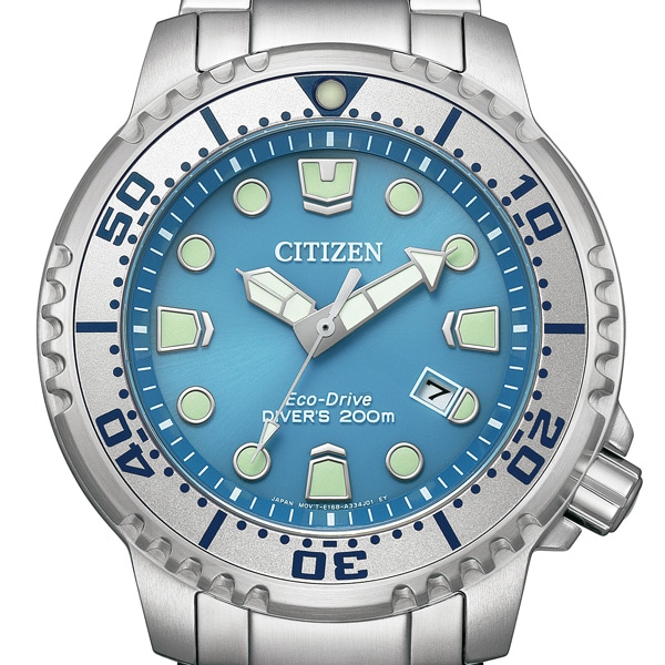 機能性、耐久性、安全性を兼ね備えた本格スポーツウオッチ、シチズン PROMASTER(プロマスター)。全世界で人気のダイバーモデルから、氷河や氷の洞窟をモチーフにデザインしたメタルバンドモデルが登場しました。自然豊かな氷河や氷の洞窟からインスピレーションを受けたシリーズです。バンドにはラチェット付のメタルバンドを採用。アクティブなシーンはもちろん、デイリーユースでも活躍できるモデルです。逆回転防止ベゼルやねじロックりゅうずなど、ダイビング中の安全性を考慮した本格機能も充実しています。氷河や氷山などの色味を表現した、爽やかなアイスブルーの文字板。ベゼルのアルミニウムリングにはあえて色を入れずにケースと同色で仕上げ、文字板の存在感を際立たせました。