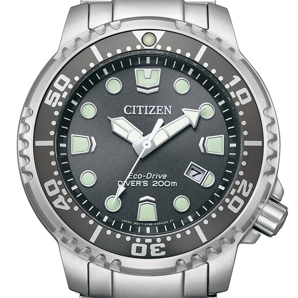 機能性、耐久性、安全性を兼ね備えた本格スポーツウオッチ、シチズン PROMASTER(プロマスター)。全世界で人気のダイバーモデルから、氷河や氷の洞窟をモチーフにデザインしたメタルバンドモデルが登場しました。自然豊かな氷河や氷の洞窟からインスピレーションを受けたシリーズです。バンドにはラチェット付のメタルバンドを採用。アクティブなシーンはもちろん、デイリーユースでも活躍できるモデルです。逆回転防止ベゼルやねじロックりゅうずなど、ダイビング中の安全性を考慮した本格機能も充実しています。氷の洞窟の暗がりを表現した文字板。単なるグレー色ではなく、パール調のグレー仕上げとすることで光沢感を演出しています。