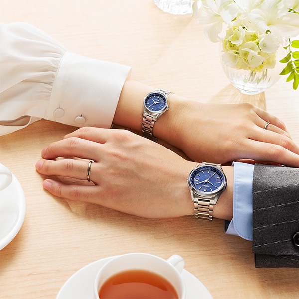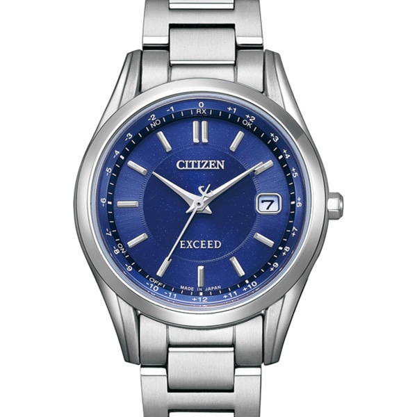 確かな品質と洗練されたデザイン。大人のためのドレスウオッチ、シチズン EXCEED(エクシード)。シンプルでスマートな印象の3針モデルに、ブルー文字板のペアウオッチが登場。「限界を超える」「卓越した」を意味するエクシードの名にふさわしい高機能。確かな技術と品質、洗練されたデザインをベースとした大人のための高級ドレスウオッチです。グローバル電波を受信し、現地時刻にすばやく合わせることができるダイレクトフライト機能搭載。文字板の中央とインデックス部分の文字板の仕上げを描き分け、シンプルでありながらもメリハリの効いたデザインに仕上げています。