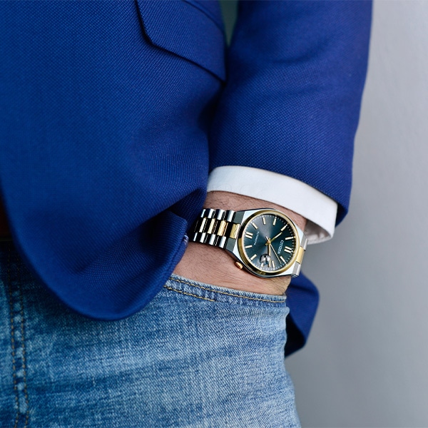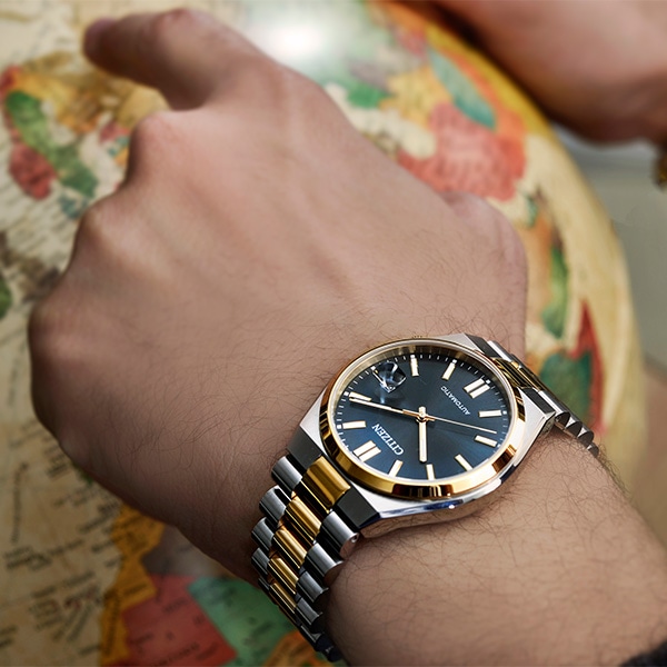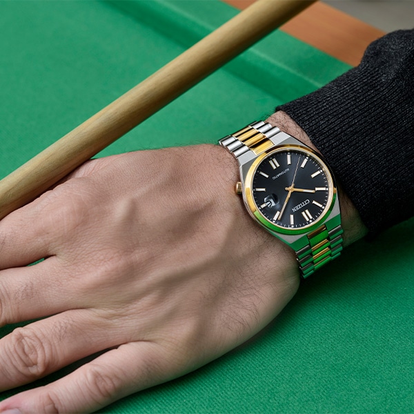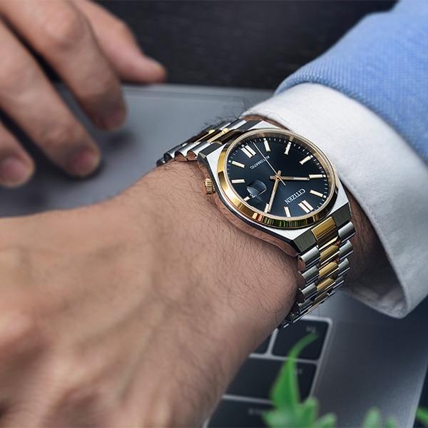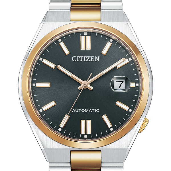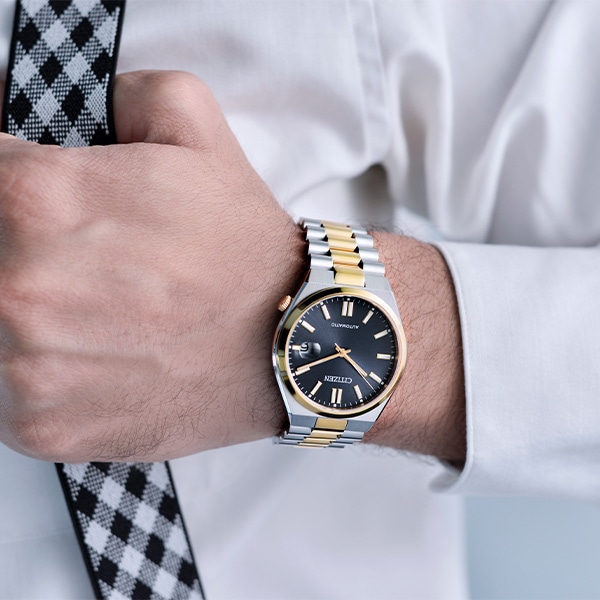 スポーティなケース形状と腕なじみの良い3列バンドで付け心地の良さにもこだわっています。カレンダー部分には、視認性を高める拡大鏡レンズを採用。裏ぶたはシースルーバック。機械式時計ならではの回転する錘(おもり)やメカの動きを楽しめます。ブラックのダイヤルをウォームゴールドとシルバーのコンビカラーで上品に仕上げた1本。
