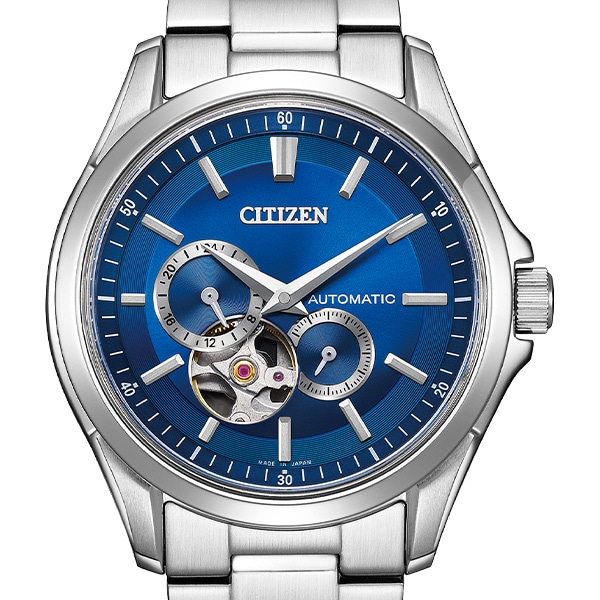 秒停止機能を搭載したキャリバーを搭載。シチズンコレクションのメカニカルウオッチがデザインをリニューアルしました。2つの別体リングを組み合わせた立体感、重厚感のあるデザイン。60秒針仕様のサブダイヤルなど、こだわりの機能を搭載しています。文字板7時の位置から、メカニカルウオッチの心臓部であるテンプの繊細な動きを堪能できるオープンハート仕様です。裏ぶたは、回転する錘(おもり)部分とメカの動きを楽しめるシースルーバック。ご自身で、簡単にバンドのサイズが調整できるシンプルアジャスト仕様です。